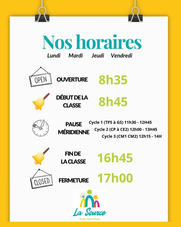 Horaires de l’école : Horaires du secrétariat – comptable : Jeudi 8H00 12H30 – 13H30 16H30 Vendredi 8H00 12H30 – 13H30 16H30